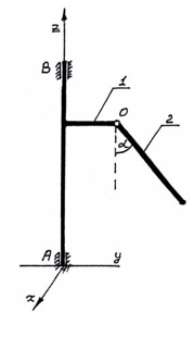 Невесомый стержень 1 и однородный стержень 2 массы 10 кг вращаются с постоянной скоростью 2 рад/с вокруг вертикальной оси. Угол наклона 45 град. Длины стержней L1=1 м, L2=2 м. Найти модуль главного вектора сил инерции, действующих на второй стержень, относительно точки О.