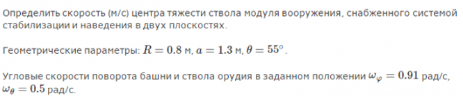 Определить скорость (м/с) центра тяжести ствола модуля вооружения, снабженного системой стабилизации и наведения в двух плоскостях.
