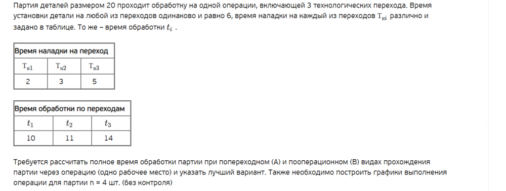 Требуется рассчитать полное время обработки партии при попереходном (А) и пооперационном (В) видах прохождения партии через операцию (одно рабочее место) и указать лучший вариант. Также необходимо построить графики выполнения операции для партии n = 4 шт. (без контроля)