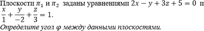 Плоскости п 1 и 2 заданы уравнениями 2х - у + 3z + 5 = 0 и x y Ꮓ + + == 1.-23 Определите угол ф между данными плоскостями.