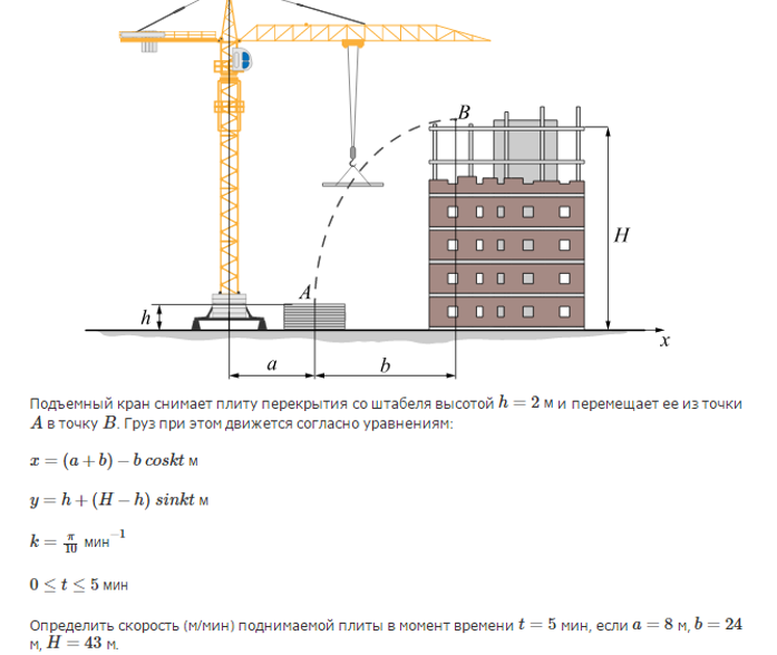 Определить скорость (м/мин) поднимаемой плиты в момент времени t = 5 мин, если а = 8 м, b = 24