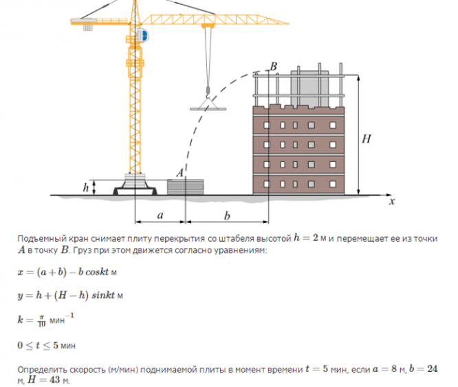 Подъемный кран снимает плиту перекрытия со штабеля высотой h = 2 м и перемещает ее из точки А в точку В. Груз при этом движется согласно уравнениям: