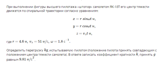 Определить перегрузку kg, испытываемую пилотом (положение пилота принять совпадающим с положением центра тяжести самолета). В ответе записать коэффициент кратности k, принять g равным 9.81 м/с2.