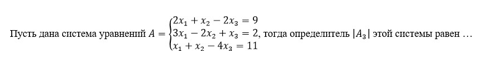 Пусть дана система уравнений А, тогда определитель этой системы равен ...