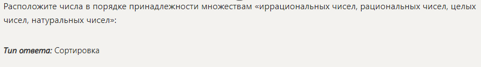 Расположите числа в порядке принадлежности множествам «иррациональных чисел, рациональных чисел, целых чисел, натуральных чисел»: