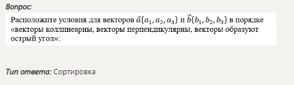 Расположите условия для векторов ä{a1, a2, a3} и {b, bz, bz} в порядке «векторы коллинеарны, векторы перпендикулярны, векторы образуют острый угол»: