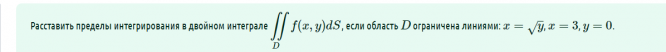 Расставить пределы интегрирования в двойном интеграле ∬Df(x,y)dS, если область D ограничена линиями: x=y√, x=3, y=0.