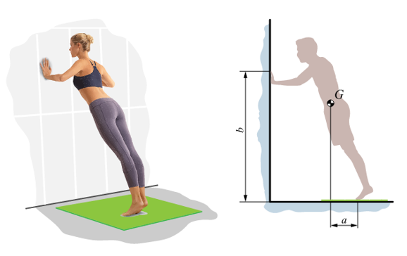 Спортсмен отжимается от гладкой стены, стоя на коврике. Найти наименьший коэффициент трения при контакте коврика с полом, при котором коврик не будет скользить, если а = 0.55 м, b = 1.1 м.