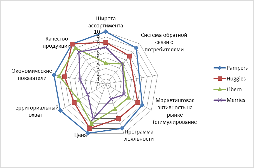 Существует определенный рейтинг компаний, выпускающих подгузники для детей. Маркетологом был проведен сравнительный анализ компании Huggies с его основными конкурентами на основе рейтинговой оценки брендов (см. таблицу ниже) и многоугольника конкурентоспособности (см. рисунок ниже).