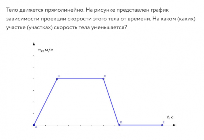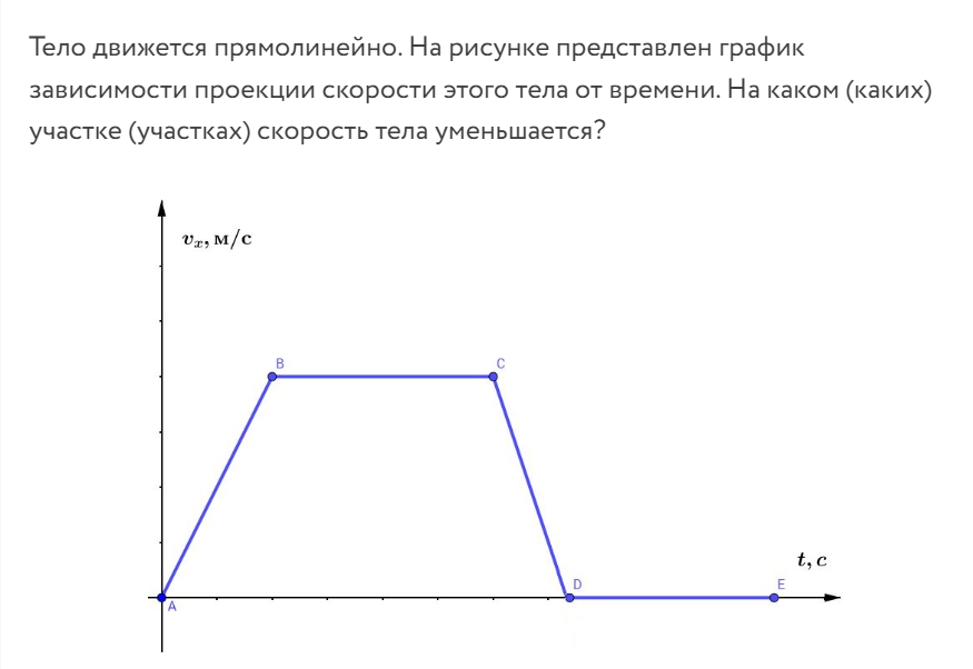 Тело движется прямолинейно. На рисунке представлен график зависимости проекции скорости этого тела от времени. На каком (каких) участке (участках) скорость тела уменьшается?