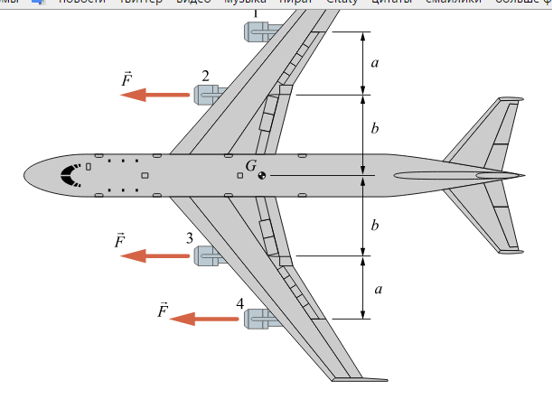 У авиалайнера с четырьмя реактивными двигателями, сила тяги которых F = 100 кН, во время полета отказал один из двигателей. Найти модуль главного вектора и модуль главного момента системы сил относительно центра тяжести авиалайнера, если а = 5.5 м ,b = 8.5 м.