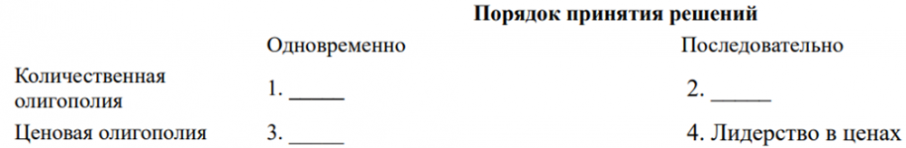 Таким образом, правильный ответ для заполнения таблицы: 1 – Модель Курно; 2 – Модель Штакельберга; 3 – Модель Бертрана.