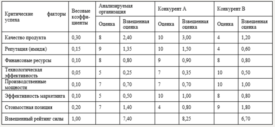 Таким образом, чтобы оценить конкурентную позицию исследуемой организации, необходимо проанализировать ее сильные и слабые стороны по сравнению с конкурентами, определить ключевые факторы успеха и сделать выводы на основе полученных данных.