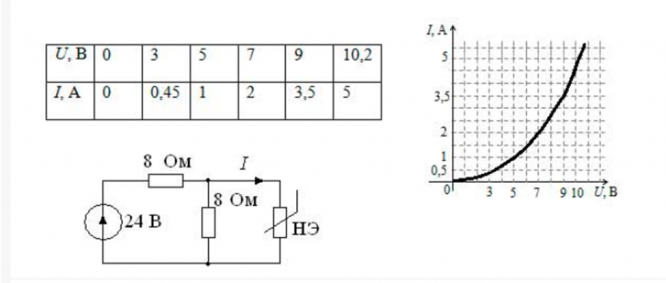 Вольтамперная характеристика нелинейного элемента задана таблично и графически. Определить ток в ветви с нелинейным элементом.