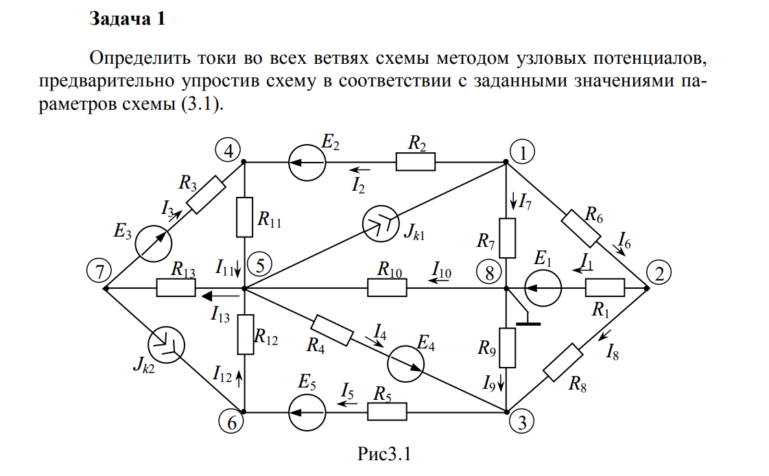 Определить токи во всех ветвях схемы методом узловых потенциалов, предварительно упростив схему в соответствии с заданными значениями параметров схемы (3.1).